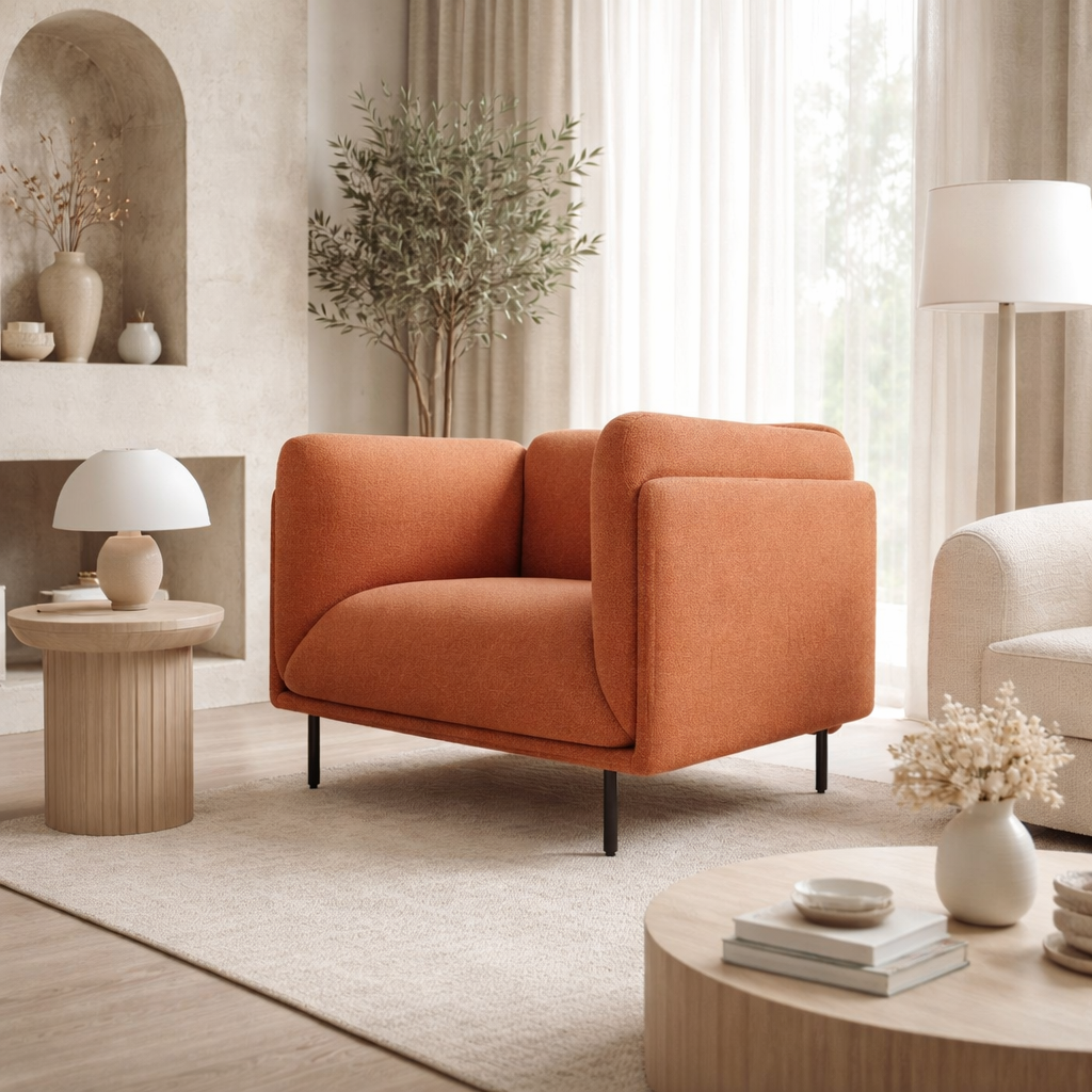 Discover unparalleled comfort and minimalist elegance with The “Aura” Armchair. Designed to envelop you in subtle luxury, this armchair features gracefully curved arms and a generously proportioned seat, inviting moments of pure relaxation. Upholstered in a premium, tactile fabric, its clean lines and refined silhouette are complemented by slender, tapered metal legs that lend an airy, contemporary feel. Each “Aura” Armchair is meticulously handcrafted in the UAE by skilled artisans, blending sophisticated design with exceptional comfort. More than just a seat, it’s a statement piece that brings a sense of serenity and modern allure to any living space.