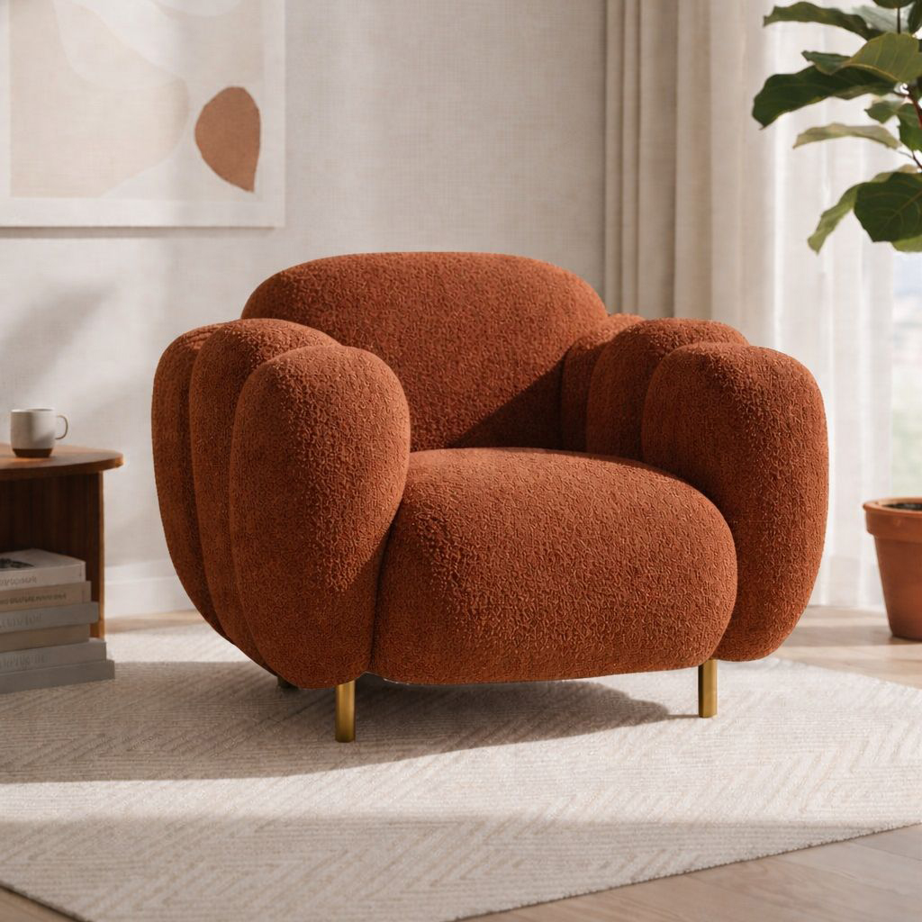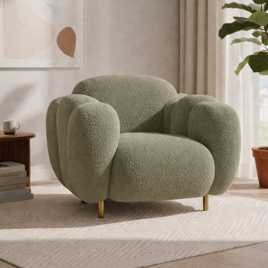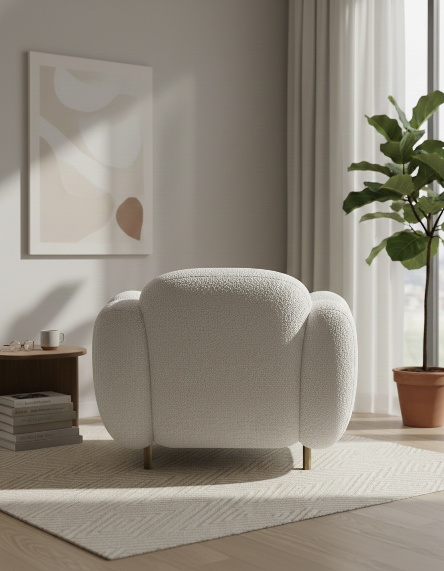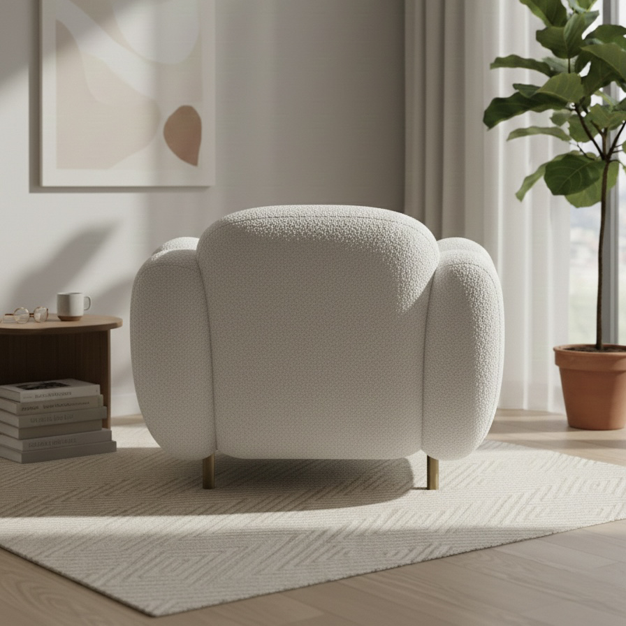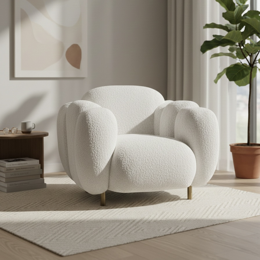 Redefine luxury lounging with the Bloom Sculptural Armchair Chair. Inspired by organic shapes and mid-century Italian design, this armchair features a dramatic, segmented backrest that mimics the unfolding of a flower. Wrapped in our signature pearl-white boucle, it brings a soft, airy feel to your space while maintaining a bold, architectural presence.