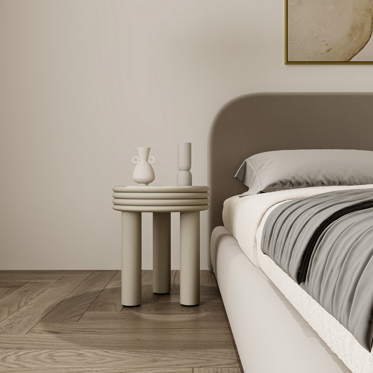 Add a bold, playful edge to your interior with the Elio Side Table. Featuring a unique triple-stacked rim and chunky cylindrical legs, this piece bridges the gap between functional furniture and contemporary art. Its muted, matte finish offers a sophisticated touch that complements neutral palettes. Its compact footprint makes it an ideal choice for urban apartments in Dubai or Abu Dhabi, serving perfectly as a bedside table, a sofa end table, or a decorative plant stand.