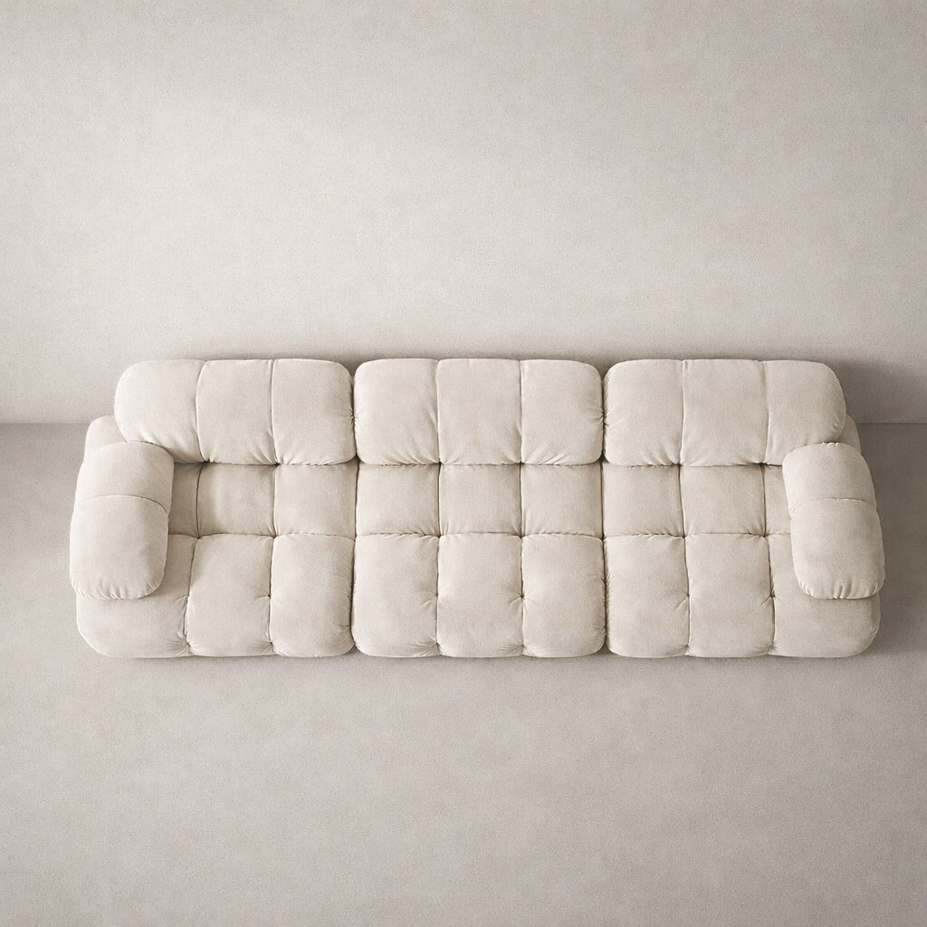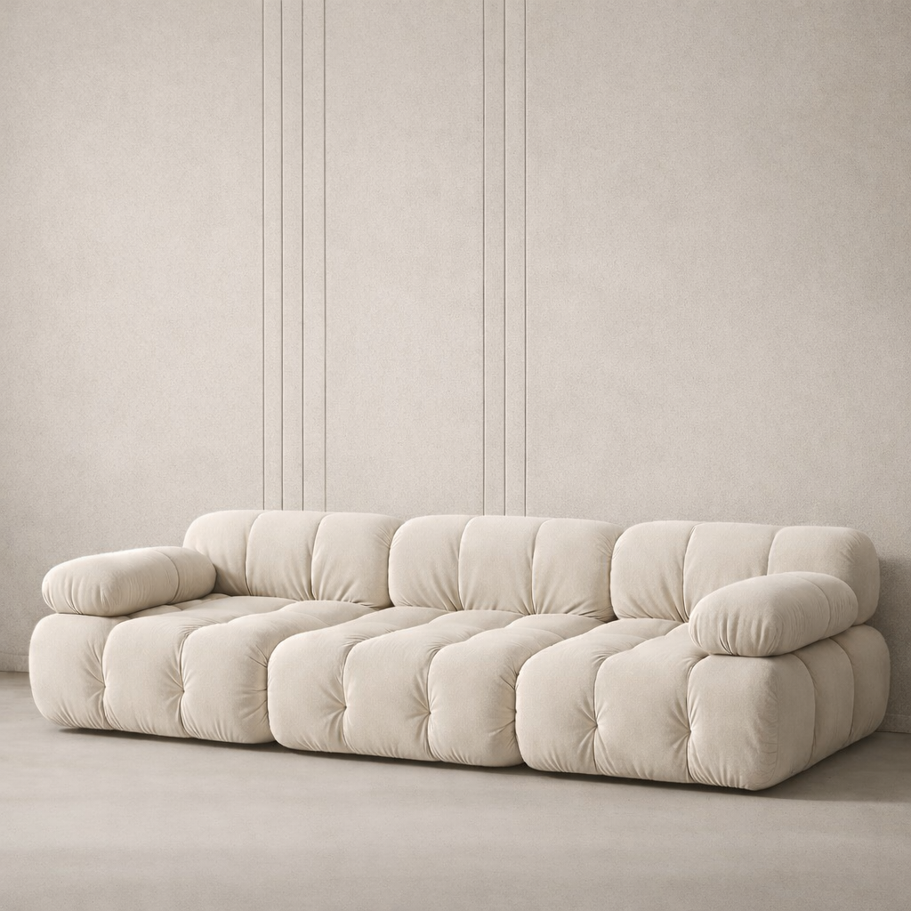 Crafted in a premium, tactile cream fabric, this 3-seater offers a “cloud-like” lounging experience. Its modular “bubble” sections provide a soft yet structured look, making it the perfect focal point for minimalist villas, Japandi interiors, or contemporary Dubai apartments.