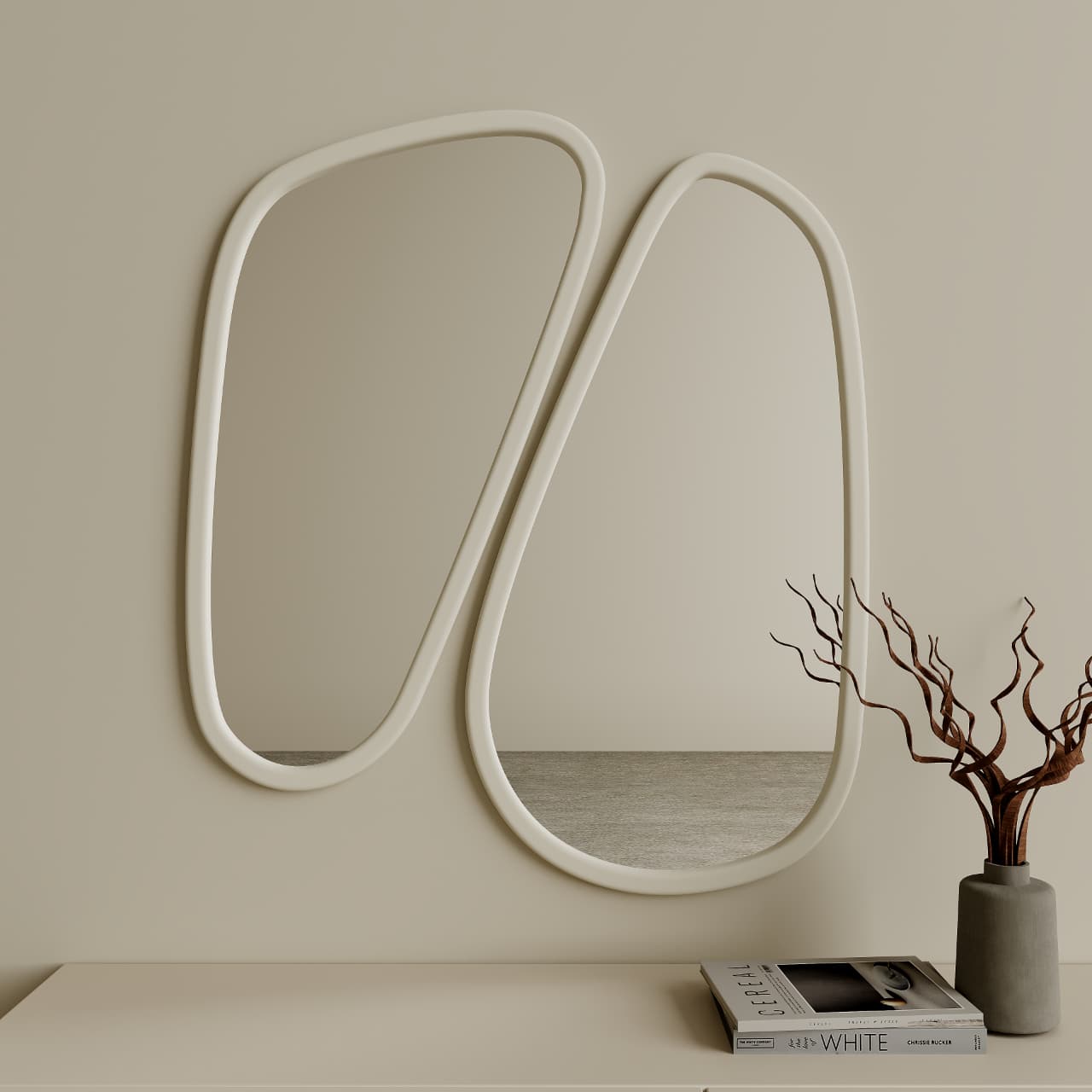 Unleash the captivating allure of the “Aeon Reflection” Mirror Set, a pair of elegantly asymmetrical mirrors that redefine modern wall decor. Inspired by the organic, ever-changing shapes found in nature, these mirrors feature unique, free-form silhouettes encased in a sleek, natural wood frame (or choose from other customizable materials). Designed to be hung together or separately, their fluid forms create a dynamic visual interest, reflecting light and expanding your space with an artistic touch. Handcrafted in the UAE with meticulous attention to detail, the “Aeon Reflection” set is more than just a functional mirror; it’s a sculptural statement that brings a harmonious blend of artistry and reflection into your home.