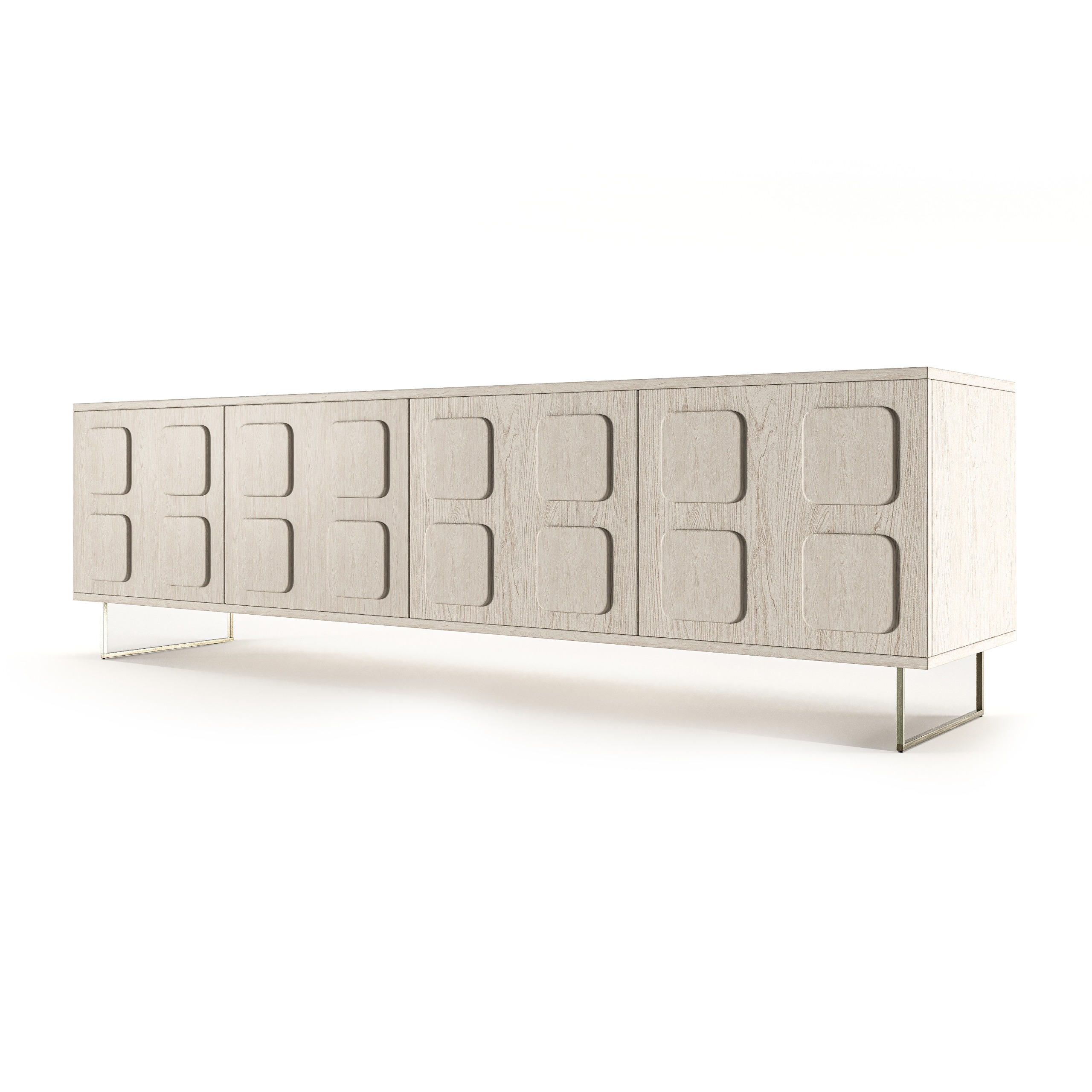 Infuse your entertainment area with the sophisticated simplicity of the “Serai” Media Console. This elegant TV cabinet, presented in two distinct styles, celebrates modern design with a touch of understated luxury. Both variations feature a clean, elongated silhouette crafted from high-quality light wood with a subtle grain texture, exuding an airy and expansive feel. One design boasts seamless, push-to-open doors with two circular integrated pulls, offering a sleek, minimalist facade. The alternative presents four individual doors, each adorned with subtly raised, geometric square panels, adding a layer of refined visual interest. Both versions are supported by slender, brushed metal legs, providing a floating appearance and contemporary flair. Handcrafted in the UAE with meticulous attention to detail, the “Serai” Media Console is a versatile and stylish solution for organizing your media while elevating your interior aesthetic.