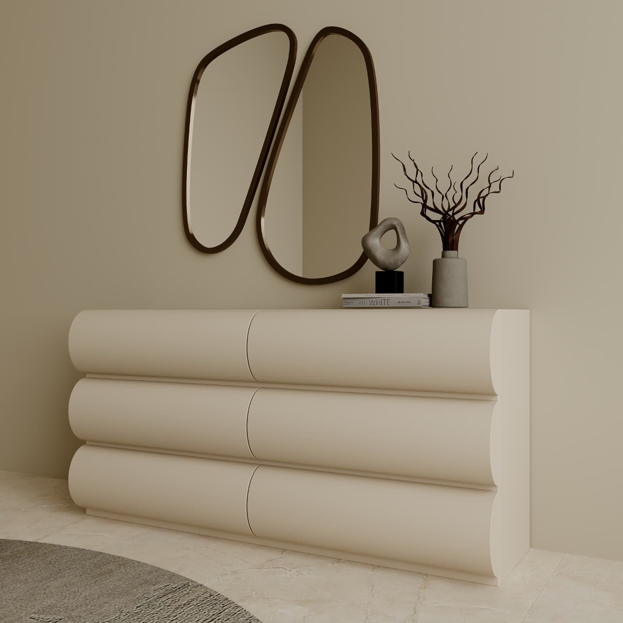 Unveil the tranquil beauty of the “Serene Ripple” Dresser, a piece that marries functional storage with captivating organic design. Inspired by the gentle undulations of natural forms, this dresser features a unique, sculpted facade with soft, rounded edges, creating a soothing visual rhythm across its surface. Crafted from premium [Specify Wood Type – e.g., solid oak, walnut, or sustainable teak], its rich grain adds depth and warmth to any bedroom or living space. With generous drawer storage seamlessly integrated into its flowing design, the “Serene Ripple” Dresser is a testament to meticulous craftsmanship and timeless elegance, handcrafted in the UAE to elevate your home.