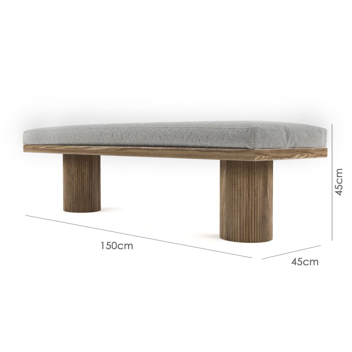 The “Zen” Bench is a striking statement piece that effortlessly blends modern aesthetics with a touch of mid-century charm. Its distinctive design features a clean, elongated silhouette and sculptural cylindrical legs, creating a sense of visual intrigue and tranquility. Crafted from a combination of solid wood and plush upholstery, the “Zen” exudes warmth and sophistication. This versatile bench can be used as seating at the foot of the bed, decorative accent, adding a touch of personality to any space.